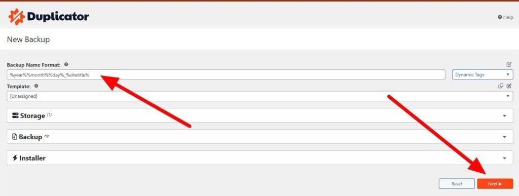 Links oben siehst Du wie der Name des Backups aussehen wird. Diese Einstellung kannst du so lassen. Klicke jetzt auf den Button "Next" rechts unten: